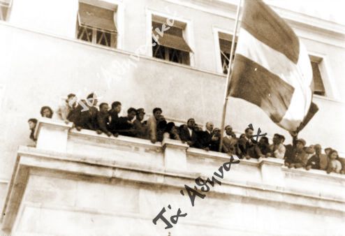 12 Οκτωβρίου 1944: Φωτογραφικό τεκμήριο από την ανάληψη του Δήμου Αθηναίων από τον Αριστείδη Σκληρό. Αριστερά του ιστού (ομιλών) διακρίνεται ο Φ. Μανουηλίδης, δεξιά του ιστού ο Αρ. Σκληρός και δίπλα του ο Ι. Κουτσοχέρας. Αρχείο Αρ. Σκληρού «Σύλλογος των Αθηναίων».