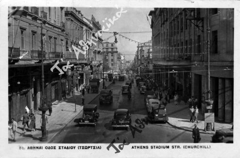 Επιστολικό δελτάριο που ταχυδρομήθηκε τον Αύγουστο του 1951 από την Αθήνα στην Αλεξάνδρεια της Αιγύπτου. Παρουσιάζει την οδό Σταδίου με διπλή ονομασία (Σταδίου-Τσώρτσιλ). Αρχείο Αρ. Σκληρού «Σύλλογος των Αθηναίων»