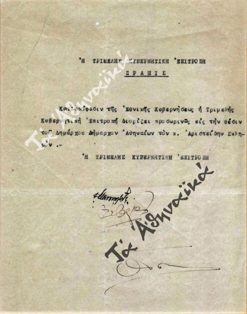Ο διορισμός του Δημάρχου Αριστείδη Σκληρού από την τριμελή επιτροπή που αποτελείτο από τους Θεμ. Τσάτσο, Φ. Μανουηλίδη και Γιάννη Ζεύγο. Αρχείο Αρ. Σκληρού «Σύλλογος των Αθηναίων».