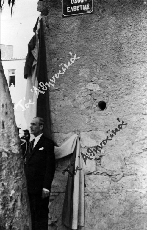 Στιγμιότυπο από την εντοίχιση της πινακίδος της οδού Ελβετίας (21 Οκτωβρίου 1945), της οποίας το όνομα δόθηκε σε τμήμα της οδού Σπευσίππου. Αρχείο Αρ. Σκληρού «Σύλλογος των Αθηναίων».