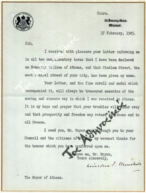 Επιστολή του Ουίνστων Τσώρτσιλ στον Δήμαρχο Αριστείδη Σκληρό (Φεβρουάριος 1945). Αρχείο Αρ. Σκληρού «Σύλλογος των Αθηναίων».