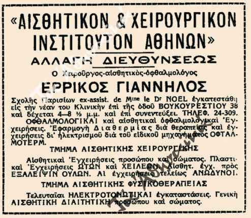 Το 1934 είχε οργανωθεί πλέον πλήρως και δεχόταν τους πελάτες του στο «Αισθητικόν και Χειρουργικόν Ινστιτούτον Αθηνών» (Βουκουρεστίου 38). Την ίδια εποχή όμως λειτουργούσε και η Academie de Beaute της Madame Ketty στην οδό Πραξιτέλους 11[4]. Η τελευταία υποσχόταν ότι «εντός ολίγης ώρας επιτυγχάνεται η εξάλειψις των ρυτίδων εν γένει, των θυλάκων των βλεφάρων, του διπλοπώγονος, παραμορφωτικών ουλών κ.τλ.». Επίσης επιτυγχανόταν «η ανύψωσις και η αισθητική διαμόρφωσις του στήθους» αλλά και «ωτοπλαστική». Και για να διασκεδάζονται οι ανησυχίες όσων φοβούνταν, επιτρεπόταν τις επεμβάσεις να παρακολουθεί, εάν ήθελε, και ο οικογενειακός γιατρός των ενδιαφερομένων.