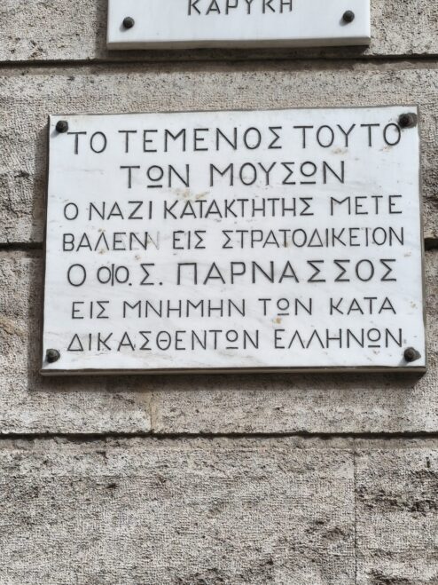 Είναι ωστόσο χαρακτηριστικό το γεγονός για τη βαθιά επιρροή που είχε ασκήσει στις ψυχές των Ελλήνων η επιλογή των κατακτητών να μετατρέψουν τους χώρους ενός παραδοσιακού πνευματικού Ιδρύματος της χώρας σε χώρους μαρτυρίου, όπου Έλληνες πατριώτες «σέρνονταν κρεουργημένοι από τα μαρτύρια των Ες – Ες και της Γκεστάπο για να ακούσουν την καταδίκη τους».[8] Στις 12 Οκτωβρίου 1988 ο ιστορικός «Φιλολογικός Σύλλογος Παρνασσός» τίμησε τη μνήμη των Ελλήνων που καταδικάστηκαν από τα ναζιστικά στρατοδικεία, τα οποία λειτούργησαν στις αίθουσές του κατά την περίοδο της Κατοχής. Την ημέρα εκείνη αποκαλύφθηκε και η μαρμάρινη πινακίδα που εντοιχίστηκε στην είσοδο του κτιρίου και στην οποία αναγράφονται τα εξής: «Το τέμενος τούτο των Μουσών ο ναζί κατακτητής μετέβαλεν εις Στρατοδικείον. Ο Φιλολογικός Σύλλογος Παρνασσός εις μνήμην των Ελλήνων».[9]