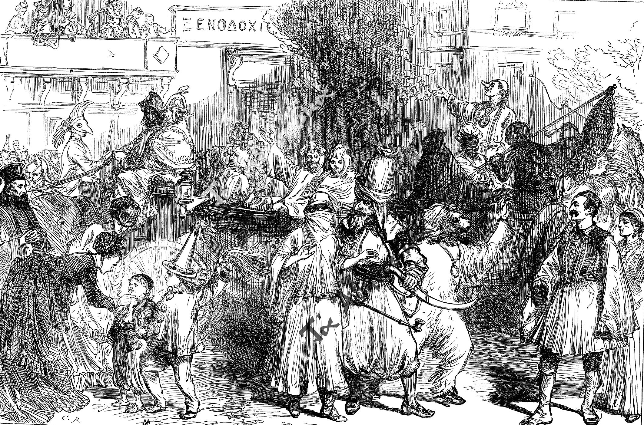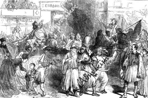Οι αποκριάτικες γιορτές δεν έλειψαν και στα χρόνια της Επανάστασης. Οι περιηγητές που επισκέφθηκαν την Αθήνα τα χρόνια του Αγώνα διέσωσαν θαυμάσιες εικόνες και μας πληροφορούν σχετικά για τα ανήσυχα εκείνα χρόνια. Ένας εξ αυτών είναι και ο περίφημος Ζαν Φρανσουά Μαξίμ Ρεμπώ (1795-1894), ο Γάλλος φιλέλληνας και συγγραφέας, που βρέθηκε να πολεμά με το καρυοφύλλι στο χέρι[4].