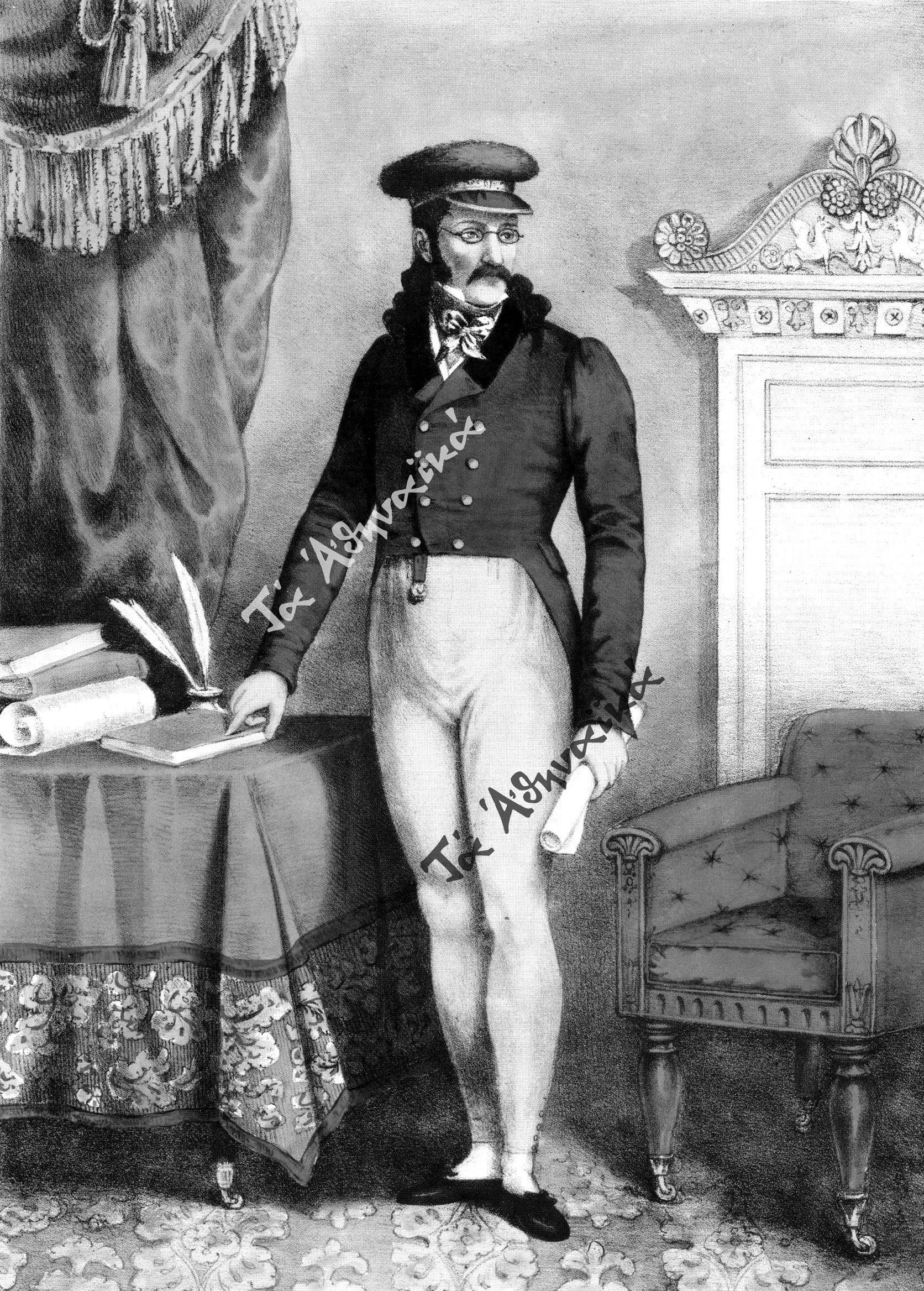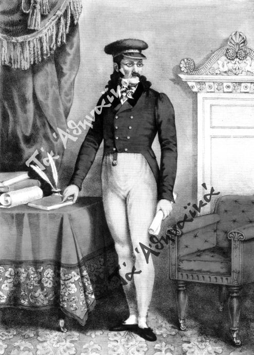 Αλέξανδρος Μαυροκορδάτος, επιζωγραφισμένη λιθογραφία. A. Friedel (1828). Aπό τις συλλογές του Εθνικού Ιστορικού Μουσείου.
