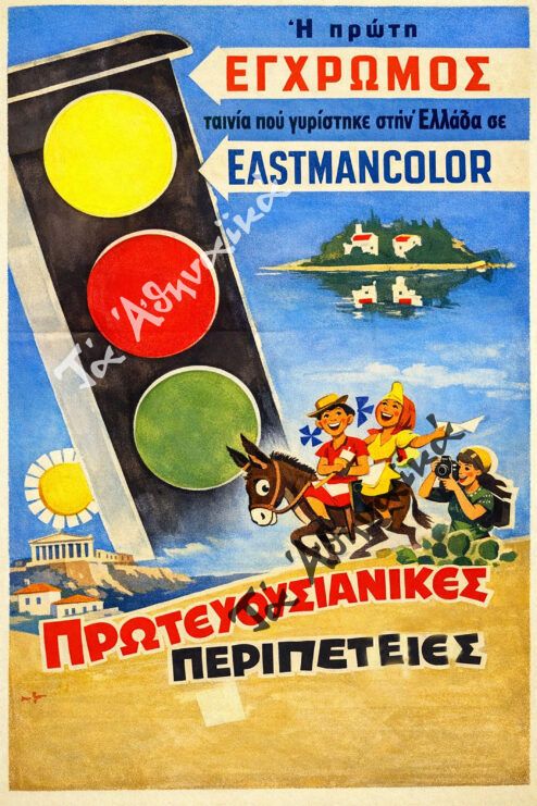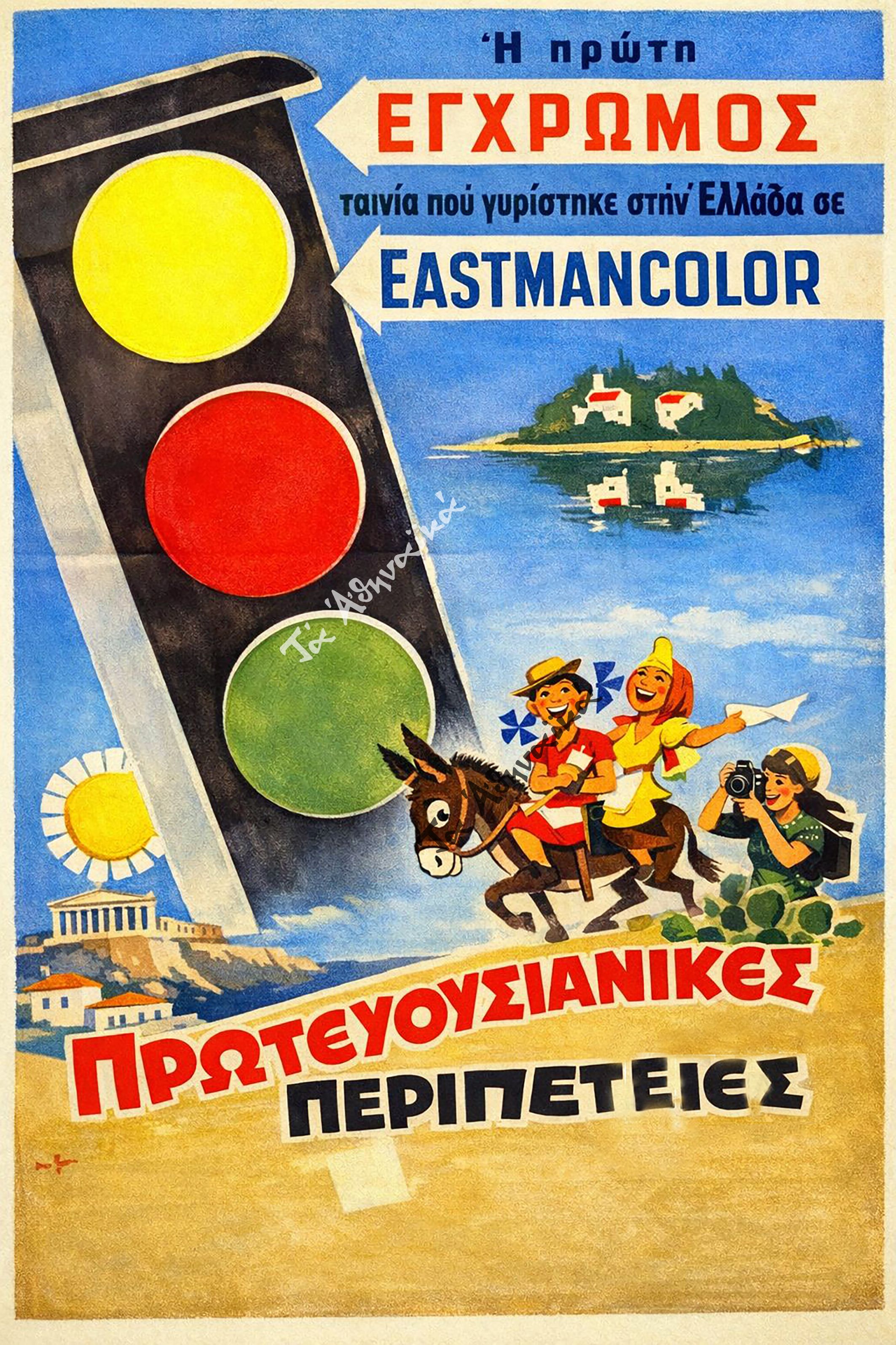 Αυτές ήταν μερικές από τις ταινίες που εμφανίστηκαν πριν από επτά δεκαετίες, αλλά το γεγονός που ενθουσίασε τους κινηματογραφόφιλους ήταν ότι μπορούσαν πλέον να απολαμβάνουν έγχρωμες ελληνικές ταινίες! Για πρώτη φορά μπορούσαν να απολαμβάνουν την ομορφιά της ελληνικής φύσης και τη μεγαλοπρέπεια της κοσμοπολίτικης Αθήνας με χρώμα. Ακόμη βεβαίως η επεξεργασία των έγχρωμων ταινιών γινόταν στο εξωτερικό και χρειάστηκε να περάσει μια ολόκληρη δεκαετία προκειμένου να πραγματοποιείται εξ ολοκλήρου η επεξεργασία τους σε ελληνικά εργαστήρια[3]. Πρώτη έγχρωμη ταινία οι Πρωτευουσιάνικές Περιπέτειες με την Κερκυραία (Ρένα Βλαχοπούλου) να φθάνει για πρώτη φορά στην Αθήνα. Οι φορεσιές της Κέρκυρας με τα φανταχτερά χρώματά τους, η λεωφόρος Συγγρού και η Ομόνοια, το Σύνταγμα, μια πανδαισία υλικού που αποτελεί πλέον και ένα από τα σπουδαιότερα εικαστικά τεκμήρια. Όσο για τη δεύτερη έγχρωμη ταινία ήταν Ο Αγαπητικός της Βοσκοπούλας, με τη Στέλλα Γεωργιάδη και τον Χριστόφορο Νέζερ[4]. Ήταν η τρίτη ταινία με το ίδιο θέμα που προβαλλόταν την περίοδο αυτή, θέμα στο οποίο έχουμε αφιερώσει ιδιαίτερο δημοσίευμα.